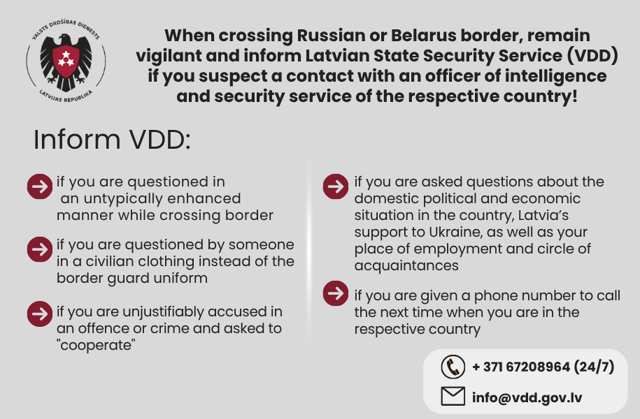 In cases of suspicion about contact with an officer of Russia’s or Belarus’ intelligence and security services, VDD urges to inform the Service about it either over the 24/7 phone +371 67208964 or via e-mail info(abols)vdd.gov.lv. VDD guarantees the confidentiality of the information provider.